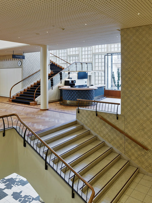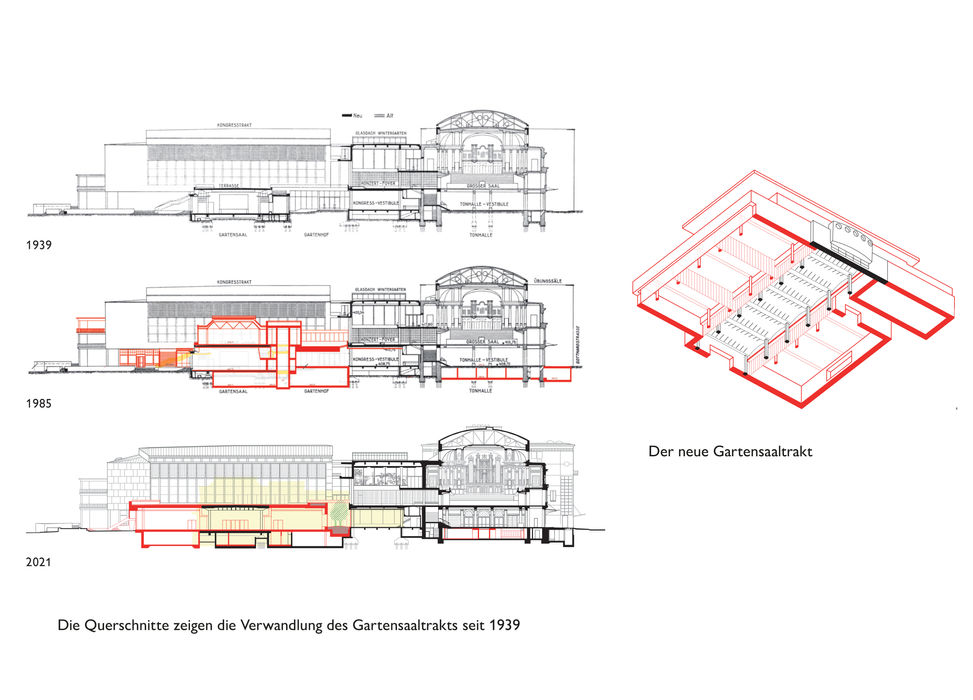 The new tasks were of a varied nature (functional improvements, building technology, fire and earthquake protection, etc.) and they were intended to connect to architectural and urban planning intentions. The greatest such measure, which was actually a castling move, was carried out where the Kongresshaus had been permanently damaged, namely in the area of the Gartensaal wing. With the demolition of the Panoramasaal of the 1980s the connection to the landscape was regained. The historical Gartensaal was converted into a foyer and flanked on both sides by two new halls. In addition, the former, somewhat isolated restaurant on the ground floor was converted into a seminar zone. All of this results in a large, continuous congress area on the ground floor. Today the new restaurant on the first floor allows the public to use the once popular terrace again.