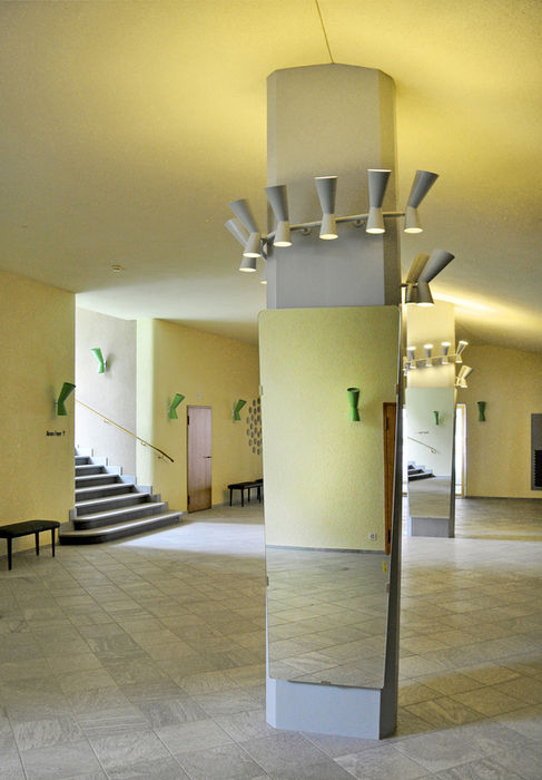 Das Projekt nimmt die einzigartige Weg-/Raumfigur ernst, indem es sich über die Vorgabe der Denkmalpflege, das Sachs-Foyer dürfe nicht tangiert werden, hinwegsetzt. Stattdessen wird die in diesem lichten Raum und seinen Treppenverbindungen angelegte Idee einer inneren Landschaft aufgenommen und weitergespielt. Einer Preziosen gleich wird das Foyer neu gefasst, liebevoll umfasst und zu einem einzigen statt der zwei geforderten Foyers entfaltet. Das alte gibt den Ton an für das Weiterbauen: räumlich, materiell und atmosphärisch.